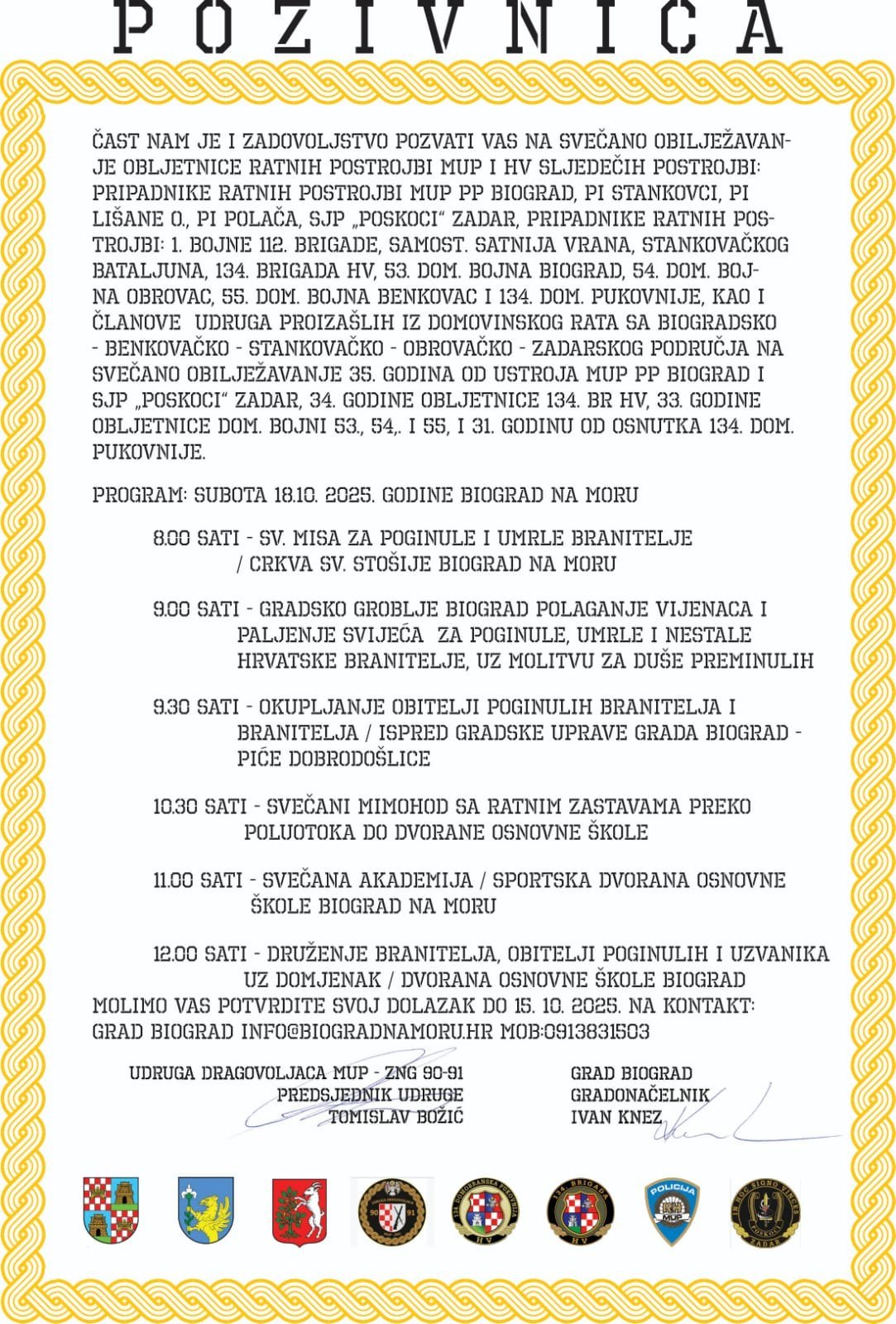 Poštovani, čast nam je i zadovoljstvo pozvati Vas na obilježavanje 34. obljetnice osnutka 134. brigade Hrvatske vojske, koja će se održati u subotu, 18. listopada 2025. godine u dvorani Osnovne škole Biograd na Moru.